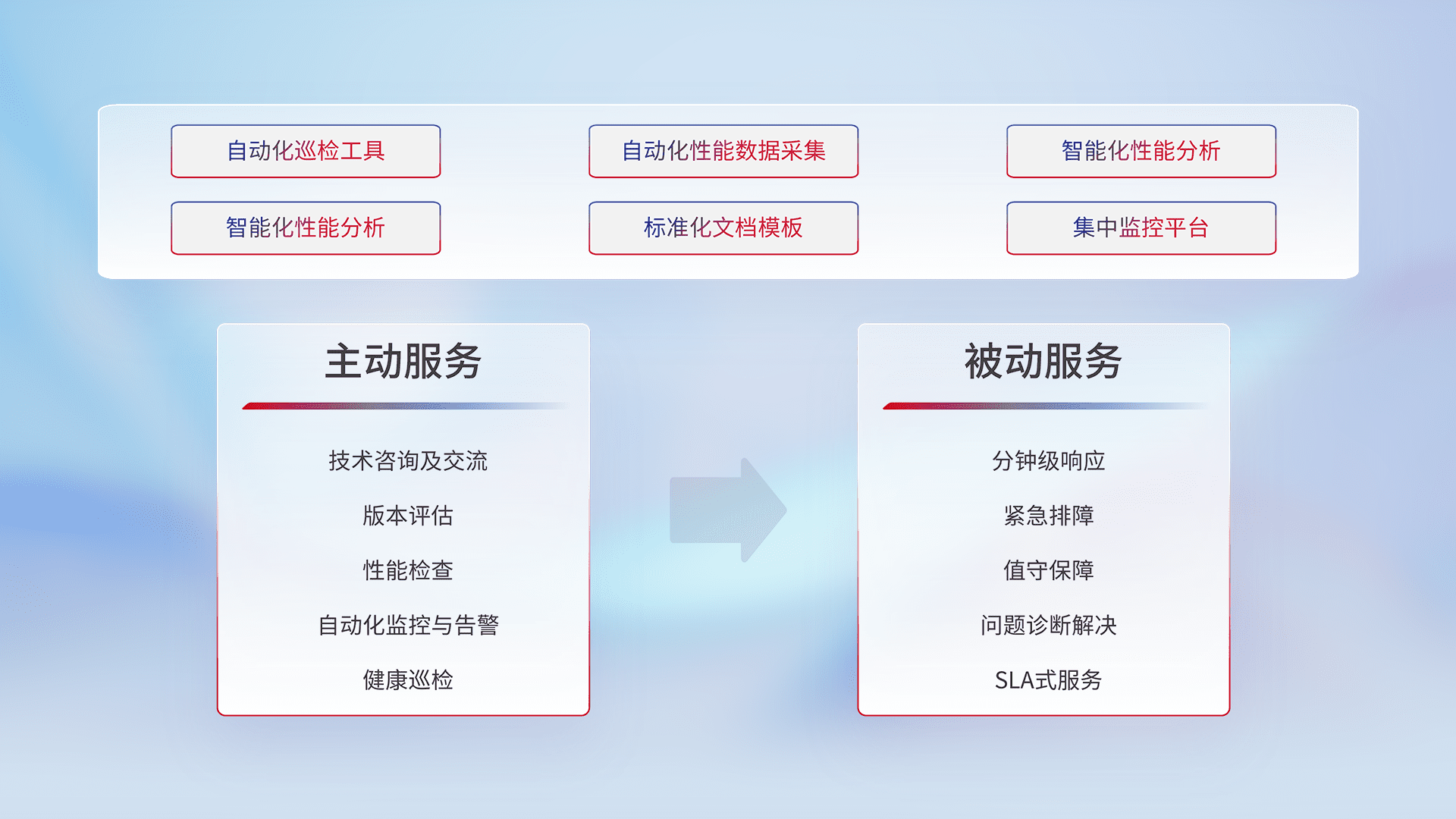 智能化工具和标准化文档,,保障服务质量,,,,提供主动服务(包含技术咨询、、、版本评估、、、、性能检查、、、自动化监控与告警、、健康巡检)和被动服务包含(分钟级响应、、、、紧急排障、、值守保障、、、、问题诊断解决、、、、SLA服务)。。。